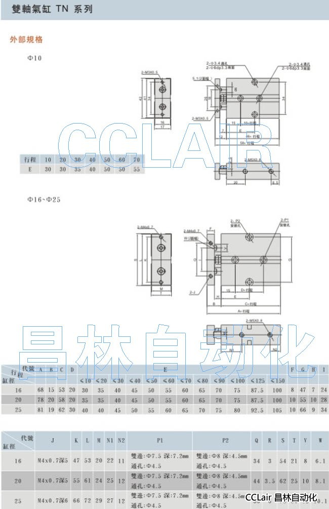 TN-10X10,TN-16X10,TN-20X10,TN-25X10,TN-32X10, 雙軸氣缸