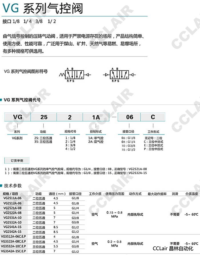 VG2511A-06,VG2512A-06,VG2521A-08,VG2522A-08,VG2531A-10,VG2541A-15,氣控閥