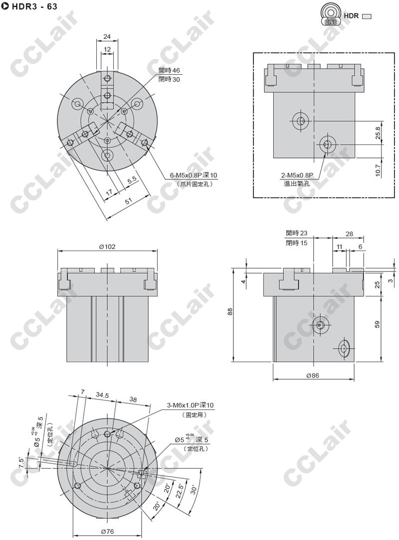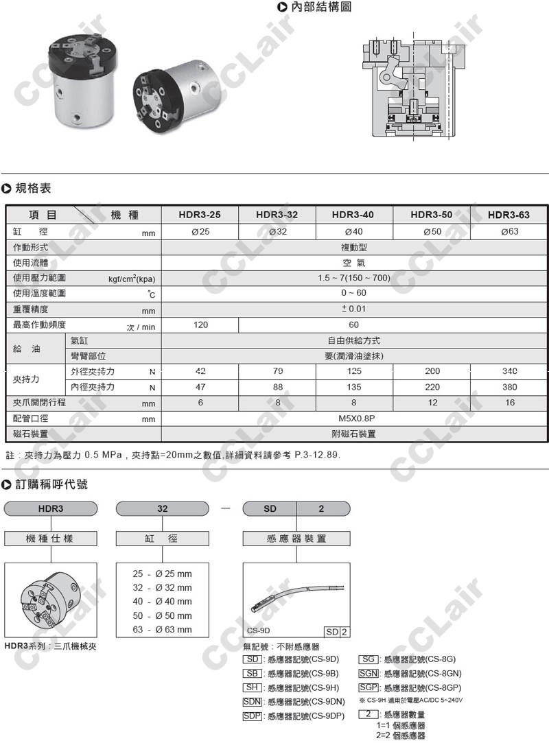 氣立可(chelic),HDR3-25-SD2,HDR3-32,HDR3-40,HDR3-50,HDR3-63,HDR325-SD2,HDR332-SD2,三爪機械夾