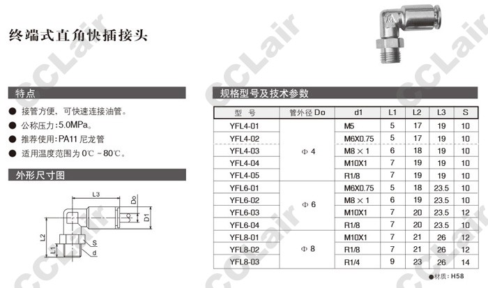 型號: YFL4,YFL6,YFL8,YFL8-01,YFL8-02,YFL4-03,YFL4-04,YFL6-01,YFL6-02,終端式直通快插接頭