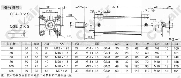 QGA2-40,QGA2-50,QGA2-63,QGA2-80,QGA2-100,QGA2-125,雙作用雙活塞桿氣缸 |