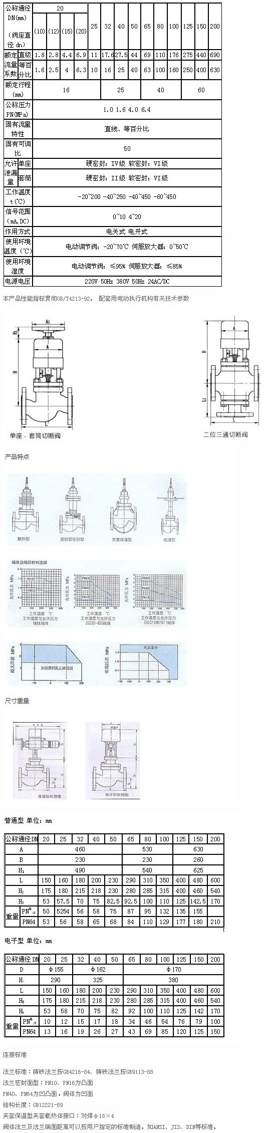 本系列產(chǎn)品公稱(chēng)通徑由20至200mm,公稱(chēng)壓力有1.0、1.6、4.0、6.4MPa,使用溫度范圍由-40℃~450℃,接受信號(hào)為0~10mA.DC或4~20mA.DC。其中電動(dòng)單座調(diào)節(jié)閥適用于壓差較小,介質(zhì)粘度較大或稍有顆粒雜質(zhì)場(chǎng)合。電動(dòng)套筒調(diào)節(jié)閥適用于壓差較大場(chǎng)合。按閥內(nèi)件密封部分材質(zhì)分又有金屬-金屬和非金屬-金屬密封兩種,后者閥關(guān)閉時(shí)泄漏量可達(dá)VI級(jí)(零泄漏)標(biāo)準(zhǔn)。按填料不同可分為一般填料密封和波紋管密封兩種,前者用一般場(chǎng)合,而后者用至不允許外漏的重要場(chǎng)合。流量特性為線性或等百分比。配用不同的執(zhí)行機(jī)構(gòu)可分為普通型和電子型兩種。多種多樣的品種規(guī)??晒┻x擇。