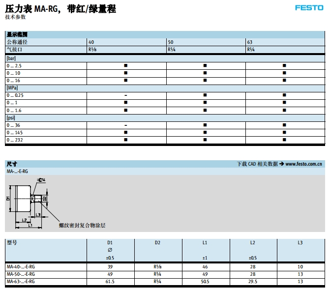 MA-40-2.5-R1/8,MA-50-10-R1/4,MA-63-16-R1/4-MPA-E-RG,festo壓力表