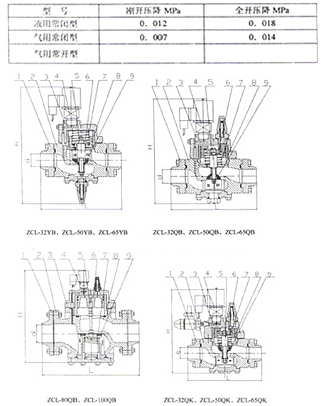 型號中ZCL為電磁主閥,緊接寫通徑,Y代表液動,Q代表氣動,B代表常閉,K代表常開。如ZCL-32YB表示通徑為32的液用常閉型電磁主閥。