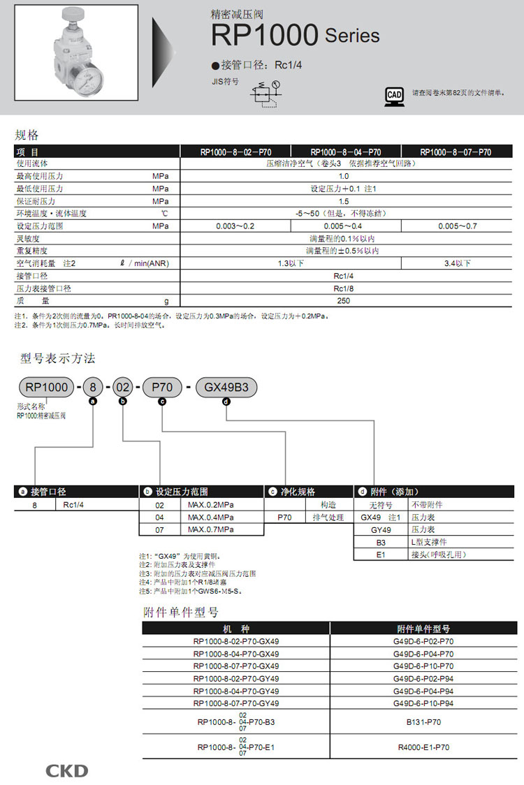 RP1000-8-02-P70,RP1000-8-04-P70,RP1000-8-07-P70,CKD精密減壓閥