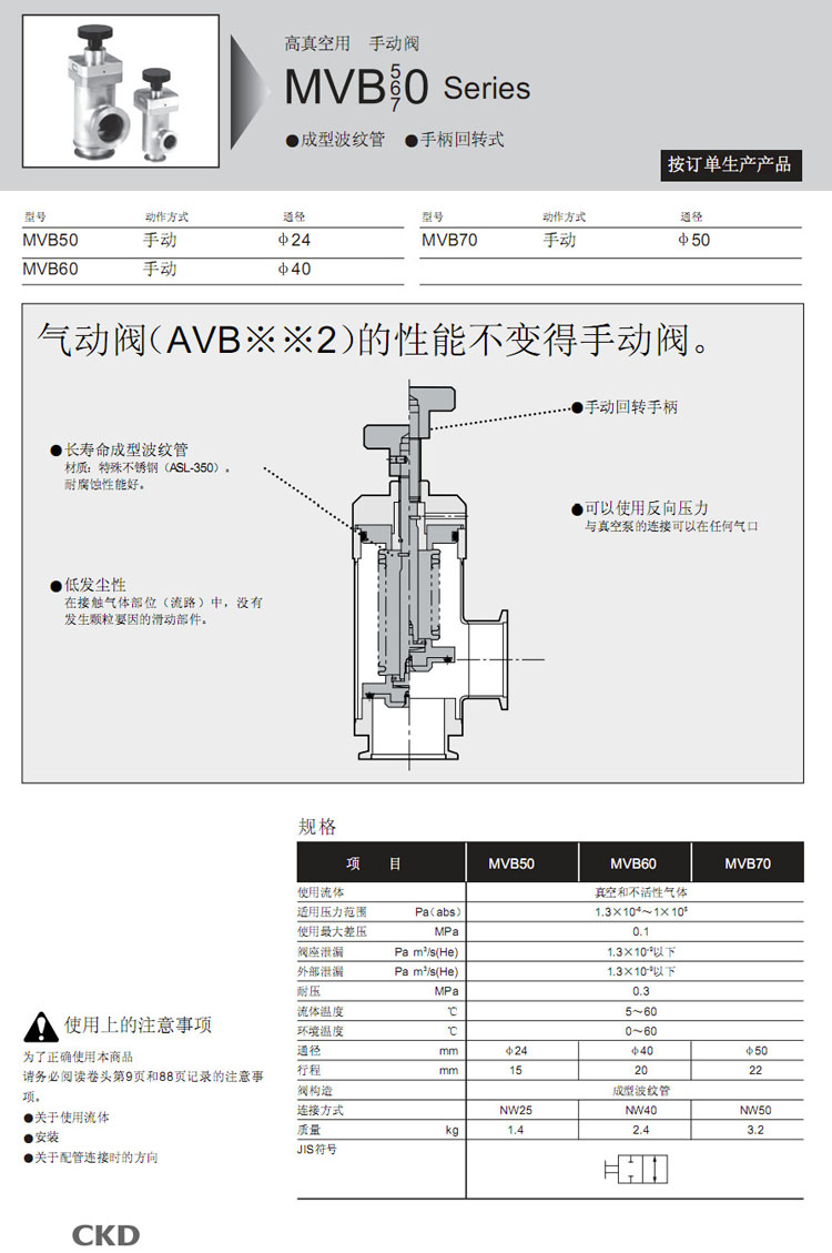 MVB50-25K,MVB60-40K,MVB70-50K,CKD高真空用手動閥