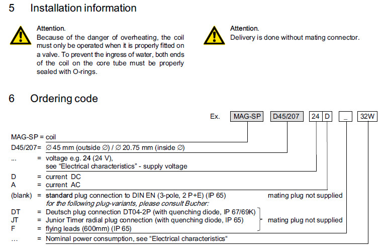 MAG-SP-D45/207-24D-27W,MAG-SP-D45/207-24D-DT-27W,MAG-SP-D45/207-24A-JT-27W,Bucher電磁閥線圈 |