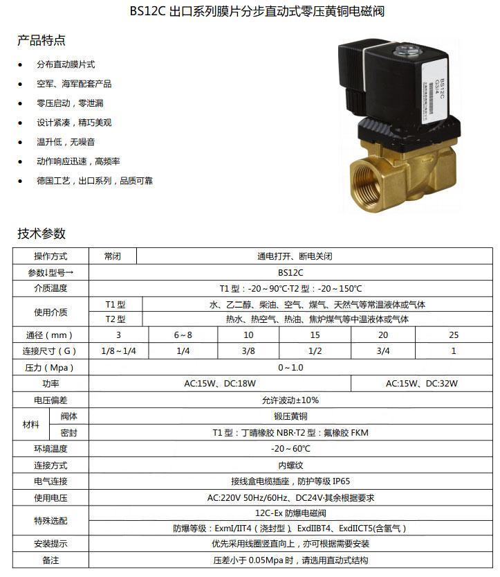 BS12C-DN3,BS12C-DN6,BS12C-DN8,BS12C-DN10,BS12C-DN15,BS12C-DN20,BS12C-DN25,零壓啟動黃銅電磁閥