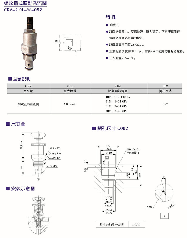CRV-2.0L-10M-82,CRV-2.0L-21M-82,CRV-2.0L-31M-82,CRV-2.0L-40M-82,螺紋插式直動溢流閥