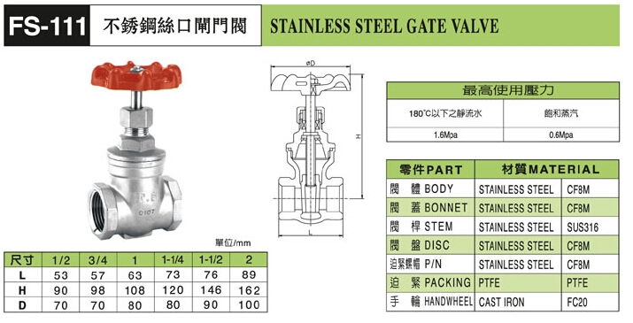 FS-111不銹鋼絲口閘閥硅溶膠鑄造閥體,工藝美觀,標(biāo)準(zhǔn)304材質(zhì),無(wú)銹斑,美國(guó)保險(xiǎn)業(yè)UL認(rèn)證。富山絲扣閘閥的啟閉件是塞形的閥瓣,密封面呈平面或錐面,閥瓣沿流體的中心線作直線運(yùn)動(dòng)。閥桿的運(yùn)動(dòng)形式,有升降桿式(閥桿升降,手輪不升降),也有升降旋轉(zhuǎn)桿式(手輪與閥桿一起旋轉(zhuǎn)升降,螺母設(shè)在閥體上)。紋管截止閥只適用于全開(kāi)和全關(guān),不允許作調(diào)節(jié)和節(jié)流。