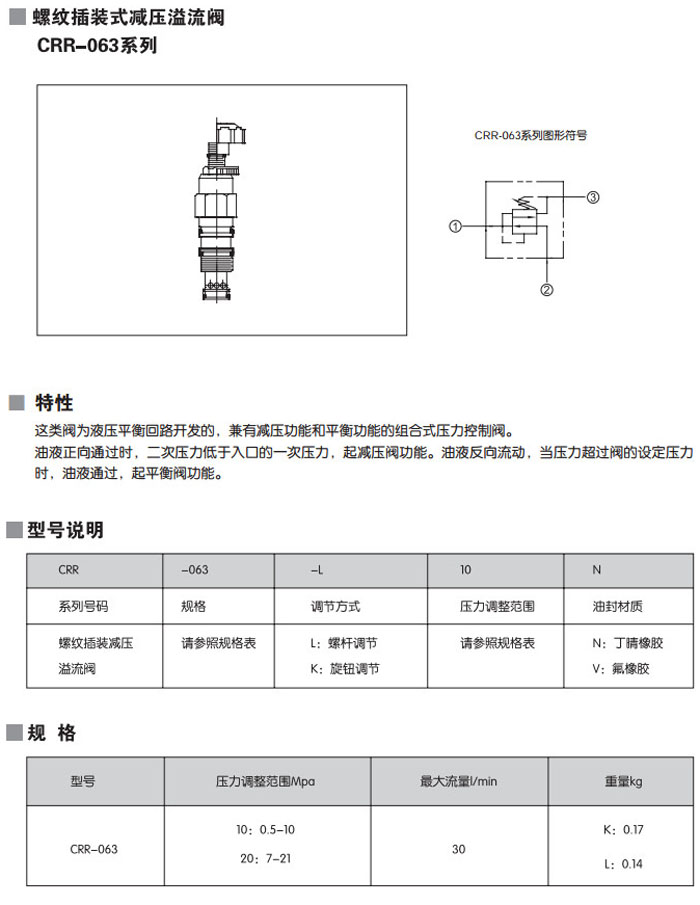 CRR-063-L10N,CRR-063-L20N,CRR-063-L10V,CRR-063-L20V,CRR-063-K10N,CRR-063-K20N,螺紋插裝式減壓溢流閥