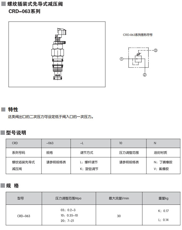 CRD-063-L03N,CRD-063-L10N,CRD-063-L20N,CRD-063-K03N,CRD-063-K10N,CRD-063-L30N,螺紋插裝式先導(dǎo)式減壓閥