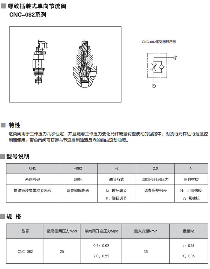 CNC-082-L2.0N,CNC-082-L0.2N,CNC-082-K2.0N,CNC-082-K0.2V,CNC-082-L2.0V,螺紋插裝式單向節(jié)流閥